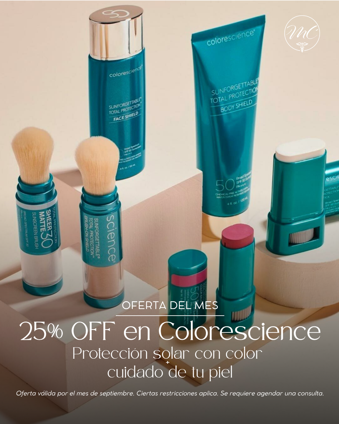 Durante todo el mes, disfruta de 25% de descuento en productos Colorescience, expertos en protección solar mineral y cuidado avanzado de la piel.