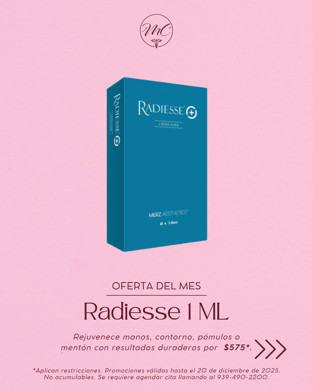Recupera el volumen y la definición facial con Radiesse, un filler que estimula la producción de colágeno. Perfecto para áreas como manos, pómulos, mentón o líneas nasolabiales.